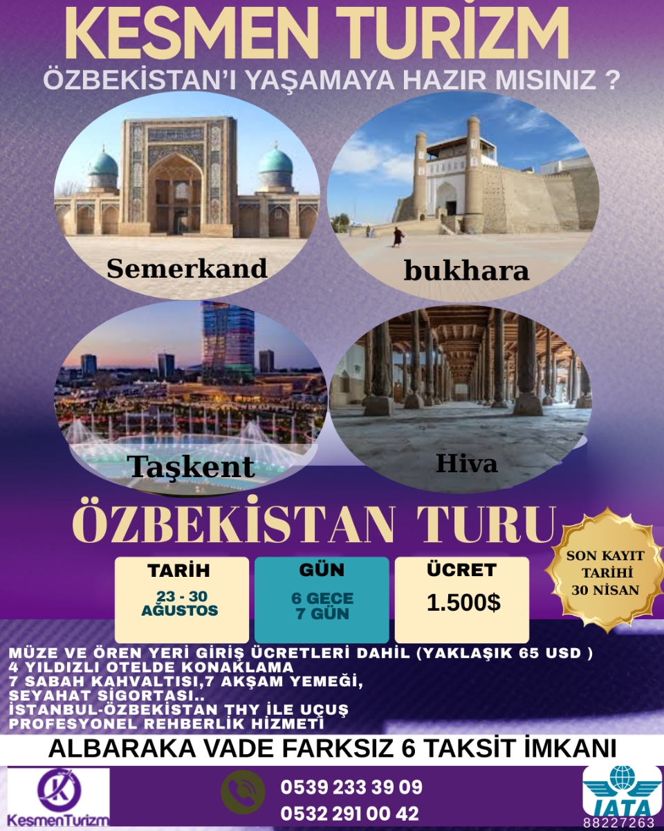 23-24-25-26-27-28-29-30 AĞUSTOS TARİHLERİ ARASINDA ÖZBEKİSTAN (HİVE-BUKHARA-SEMERKAND-TAŞKENT) GERÇEKLEŞECEKTİR.